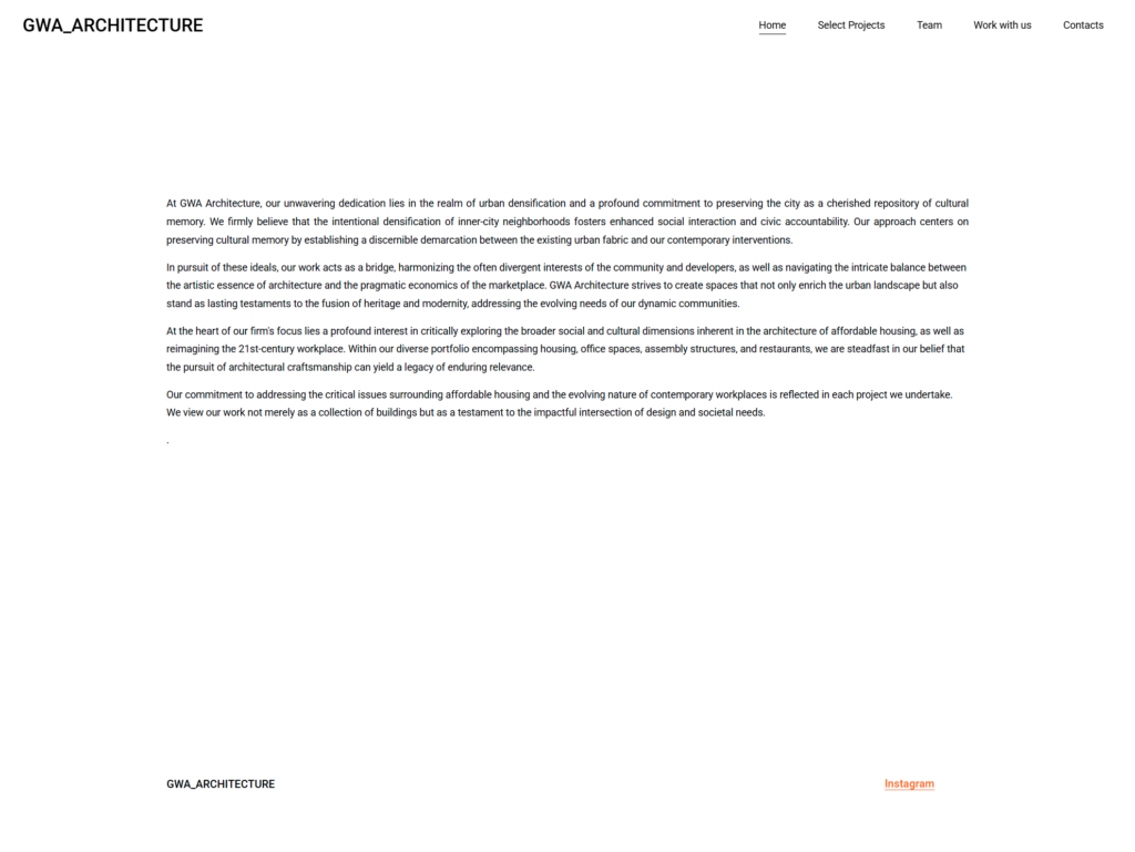 GWA Architecture approached us to redesign their website from the ground up. The goal was not simply to refresh visuals, but to create a modern, minimal, story-driven digital presence that reflects how the firm thinks about architecture: context-first, narrative-led, and deeply visual.